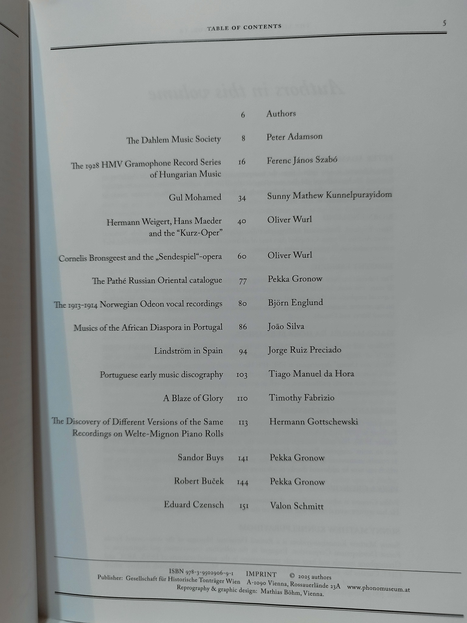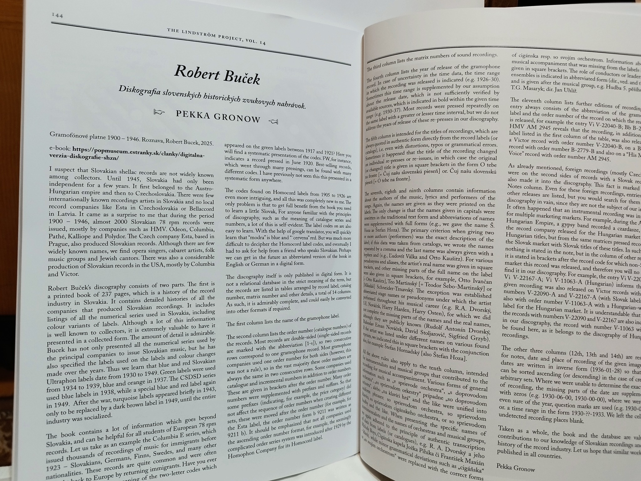 Kniha Diskografia slovenských historických zvukových nahrávok: gramofónové platne 1900 – 1946 autora Roberta Bučeka sa vďaka známemu fínskemu odborníkovi Pekku Gronowovi dostal do prestížneho zborníka The Lindström Project: Contributions To The History Of The Record Industry, ktorý nemecká Spoločnosť pre historické zvukové nahrávky (GHT) vydáva tento rok už po 14-krát. Pre autora je to cťou a veľkým zadosťučinením. Škoda len, že na rozdiel od zahraničia, tu na Slovensku je táto oblasť spolu s autorovým výskumom permanentne ignorovaná...